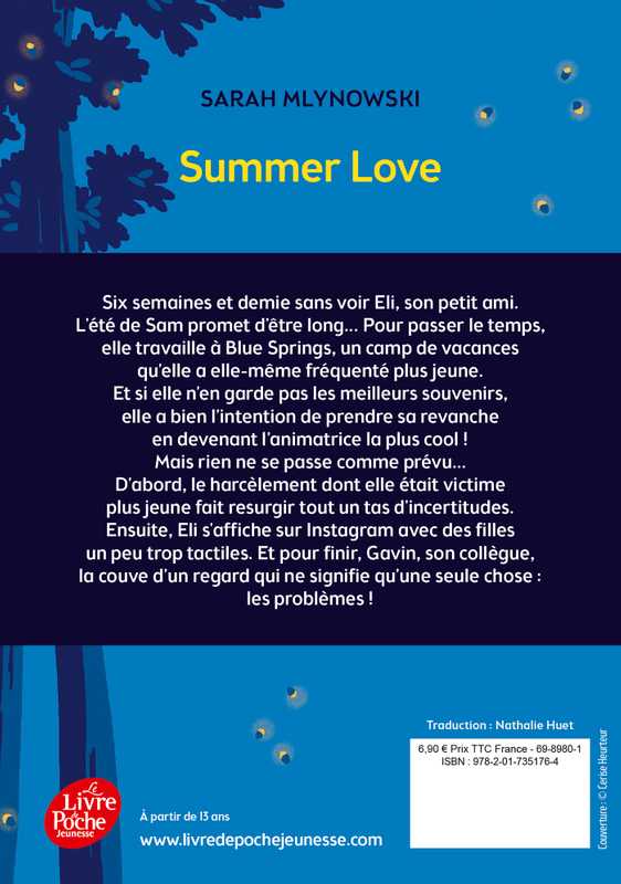 Six semaines et demie sans voir Eli, son petit ami. L'été de Sam promet d'être long... Pour passer le temps, elle travaille à Blue Springs, un camp de vacances qu’elle a elle-même fréquenté plus jeune. Et si elle n’en garde pas les meilleurs souvenirs, elle a bien l’intention de prendre sa revanche en devenant l’animatrice la plus cool ! Mais rien ne se passe comme prévu… D’abord, le harcèlement dont elle était victime plus jeune fait resurgir tout un tas d'incertitudes. Ensuite, Eli s'affiche sur Instagram avec des filles un peu trop tactiles. Et pour finir, Gavin, son collègue, la couve d’un regard qui ne signifie qu’une seule chose : les problèmes !
