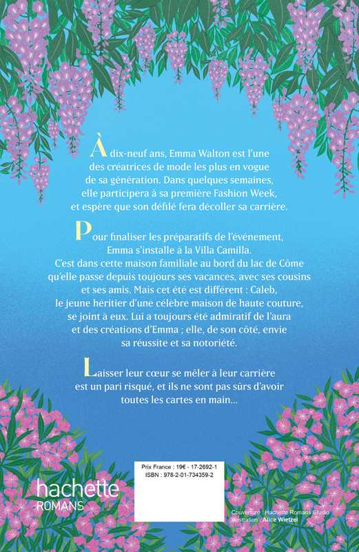 Pour finaliser les préparatifs de l’événement, Emma s’installe à la Villa Camilla. C’est dans cette maison familiale au bord du lac de Côme qu’elle passe depuis toujours ses vacances, avec ses cousins et ses amis. Mais cet été est différent : Caleb, le jeune héritier d’une célèbre maison de haute couture, se joint à eux. Lui a toujours été admiratif de l’aura et des créations d’Emma ; elle, de son côté, envie sa réussite et sa notoriété.